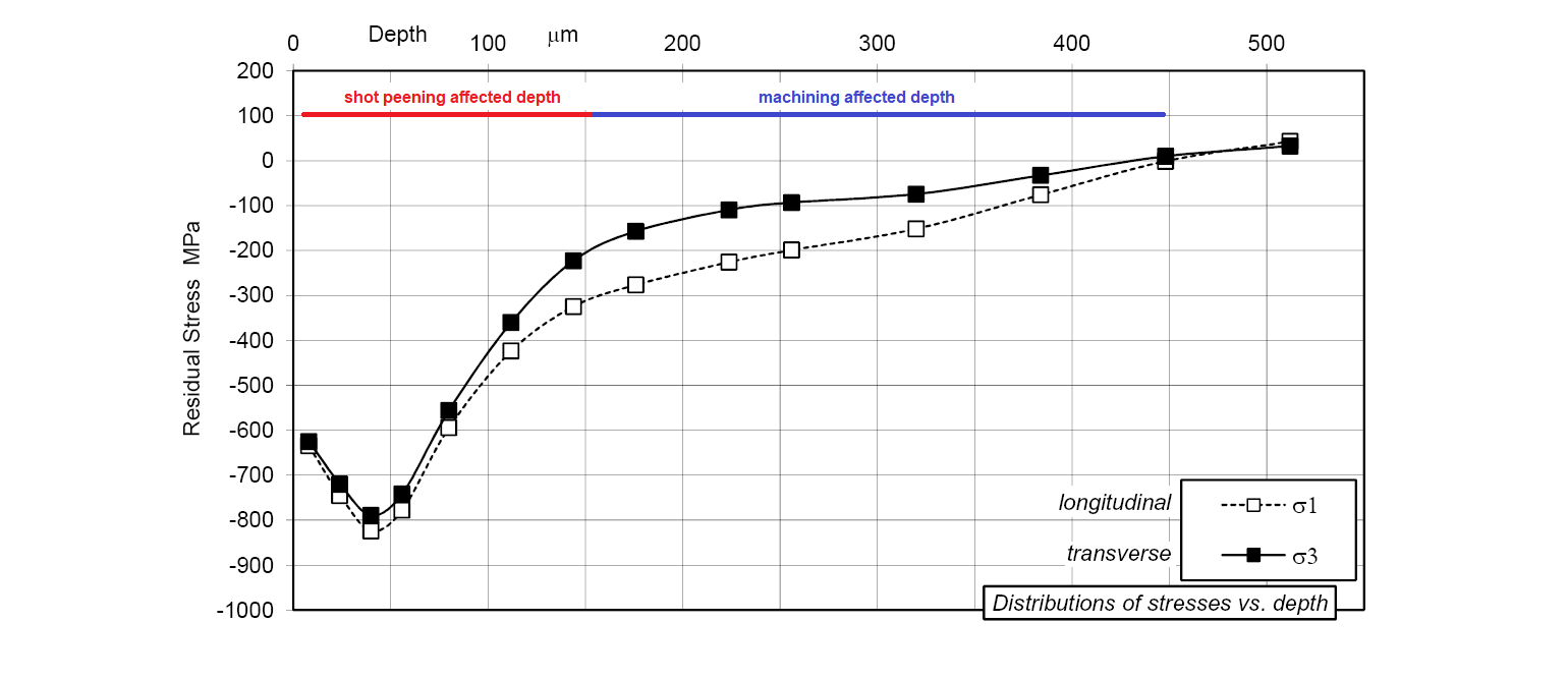 In this example, part of a forging has been shot peened and subjected to centre hole drilling (031-size gauge). Sub-surface axial stresses within the forging are seen to be compressive while circumferential stresses are tensile; differences in these stresses is around 700 to 800 MPa. The shot peening process produces near-surface compression in both axial and circumferential directions. The stress distributions show no significant residues from machining prior to shot peening.